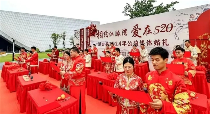一场古典又浪漫的集体婚礼在湖口县江豚湾公园举行。活动现场布置简约而喜庆,新人在嘉宾和亲朋好友的见证下喜结连理、缔结爱的承诺。拜天地、结发礼、合卺礼、告天礼、新婿描眉……一个个颇具仪式感的环节之后,在现场亲朋好友、嘉宾来客的祝福和掌声中,新人们携手奔赴婚姻殿堂。