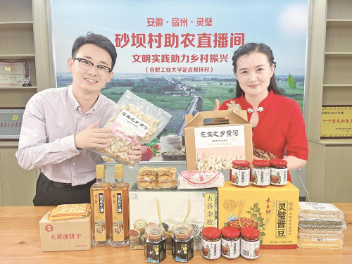 “这是我们村里产的鲜椒牛肉酱,味道鲜美,原材料品质好,屏幕下方的小黄车里就能直接下单……”日前,在灵璧县禅堂镇河北村新时代文明实践站直播间,村党支部书记张亳玲正在推介村里的特色农产品。记者在直播平台上看到,除了该村企业生产的牛肉酱、灵璧酱豆,黑花生油、菜籽油和刚刚采收的蜜薯、花生等也成为当天直播销售的“爆款”。
