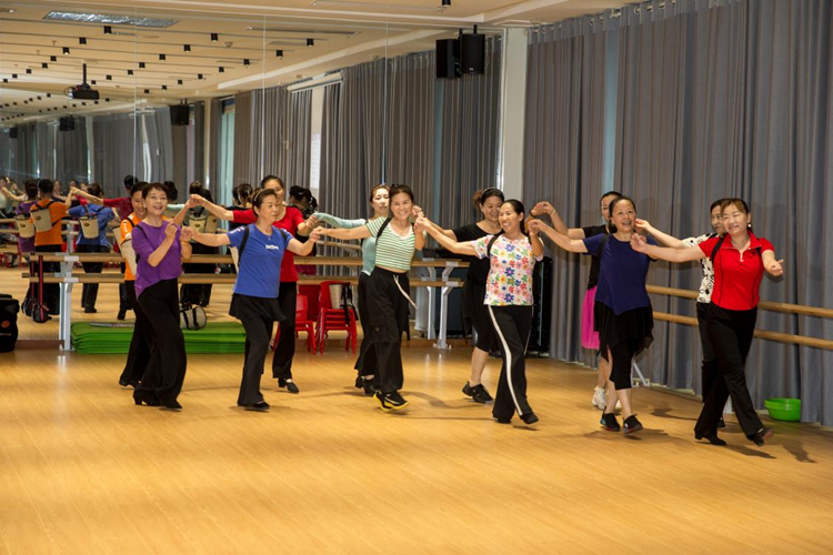 7月22日,正在湖北省咸宁市咸安区新时代文明实践中心里排练舞蹈的市民。新华网 钟奕 摄