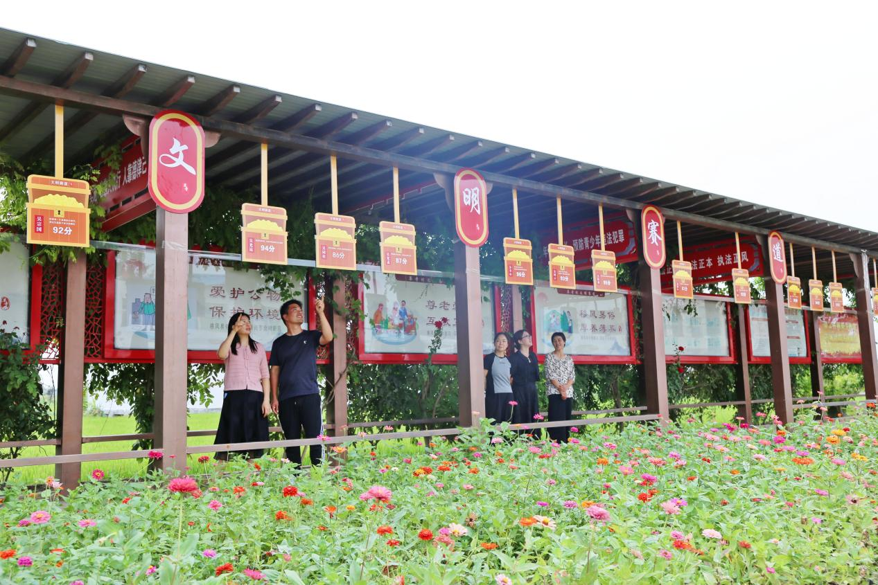 “吴光运94分”“吴光孟87分”“吴同柱86分”……为营造比学赶超氛围,草寺村利用村里最热闹的休闲长廊搭建了“文明赛道”,长廊一侧贴满了全村“文明储蓄罐”分数较高的村民积分牌,同时积分牌上印有二维码,通过扫描二维码可以清楚看到村民积分排名以及每位村民积分如何得来,让全村村民在移风易俗的擂台上以友谊和竞争的方式,相互竞技切磋、学习进步。“看到分数高的邻居,就知道了自己的差距在哪里,有时候也会暗中较劲,不能落后了。”村民吴同斌说。