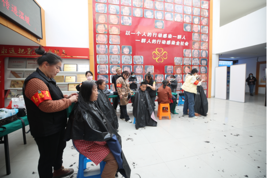 11月21日,南通市崇川区和平桥街道北濠东村社区新时代文明实践站一楼大厅正在进行公益理发活动。新华网发(江建华 摄)