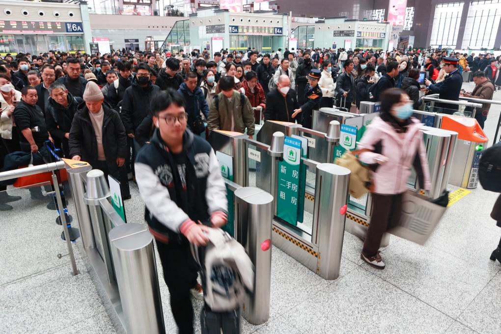 旅客在合肥南站有序检票乘车。