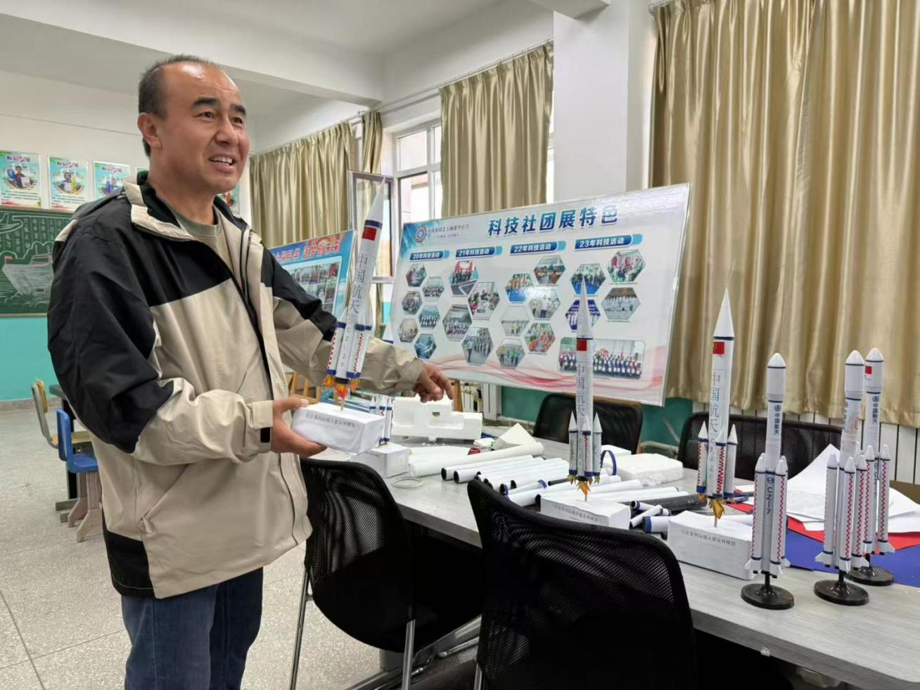 艾丁湖希望小学科学老师艾塞都拉·玉努斯展示学生们制作的航天模型。邓纯雪 摄