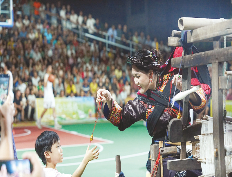 古老的织布机前,年轻的母亲正低头织锦,肩头的背带上绣着精致的纹样,里面裹着她年幼的孩子……这是青秀区主场比赛中场休息时令人惊艳的一幕。
